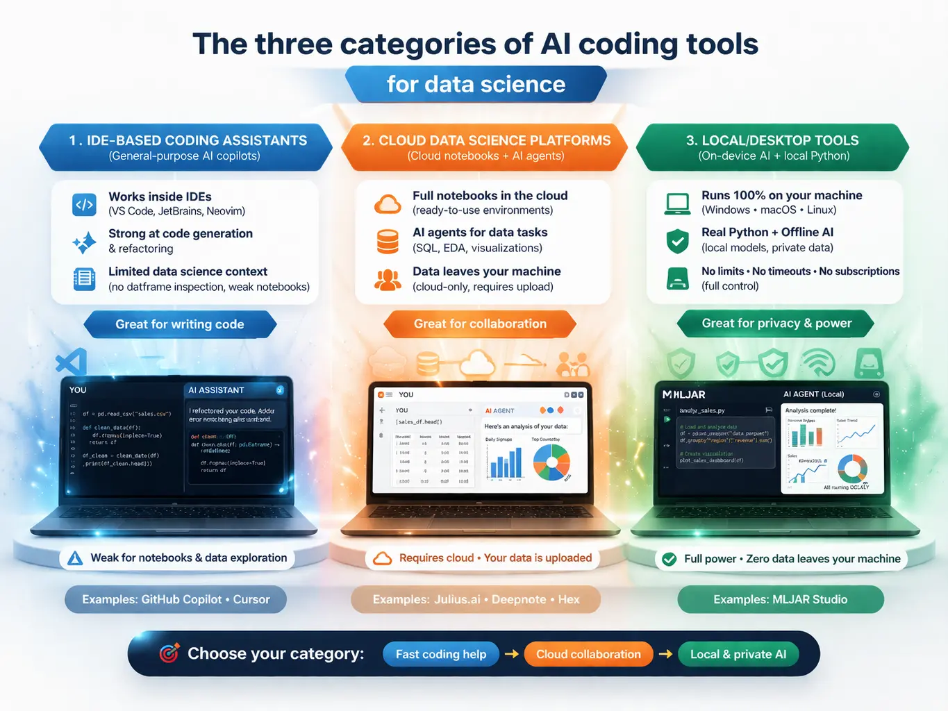 Most AI coding tools for data science are cloud-only, meaning your code and data leave your machine. MLJAR Studio is the only fully local, offline-capable alternative — with one-time pricing, built-in AutoML, and flexibility to use any LLM including local models via Ollama.