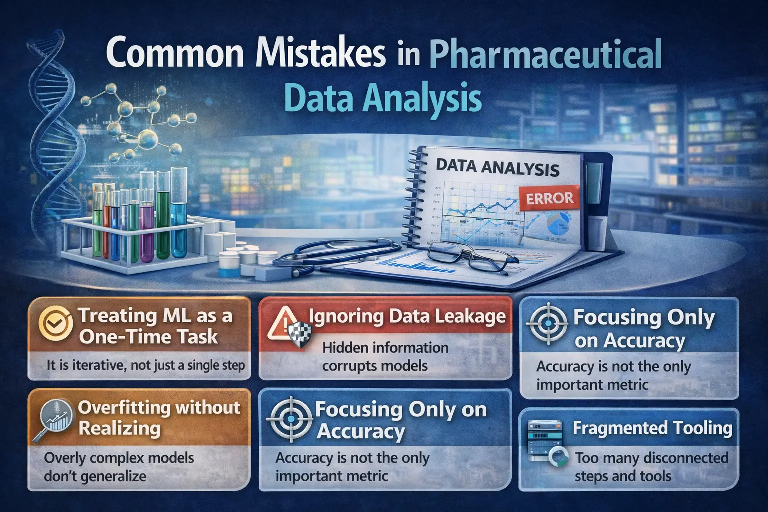 Many failures in pharmaceutical data projects are not caused by bad models, but by flawed workflows. One common mistake is treating modeling as a one-time task. In reality, it is iterative. The first model is just a starting point. Another issue is data leakage, where models accidentally use information they should not have. This leads to overly optimistic results that fail in practice. Overfitting is also common, especially with small datasets. Models appear accurate but do not generalize. Teams often focus too much on accuracy instead of understanding trade-offs. In clinical contexts, the cost of different errors matters more than a single metric. There is also the problem of explainability. In pharma, black-box models are not acceptable. Researchers must understand and justify predictions. Finally, many teams use fragmented tools. This creates inefficiencies and increases the risk of errors.