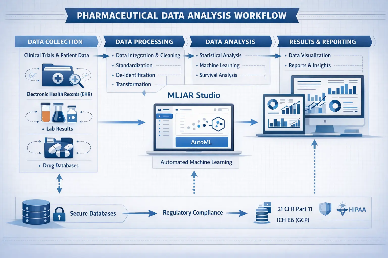 Pharmaceutical research commonly uses tools like SAS, Stata, and Python. However, modern workflows increasingly rely on platforms like MLJAR Studio that combine data analysis with machine learning and automation.