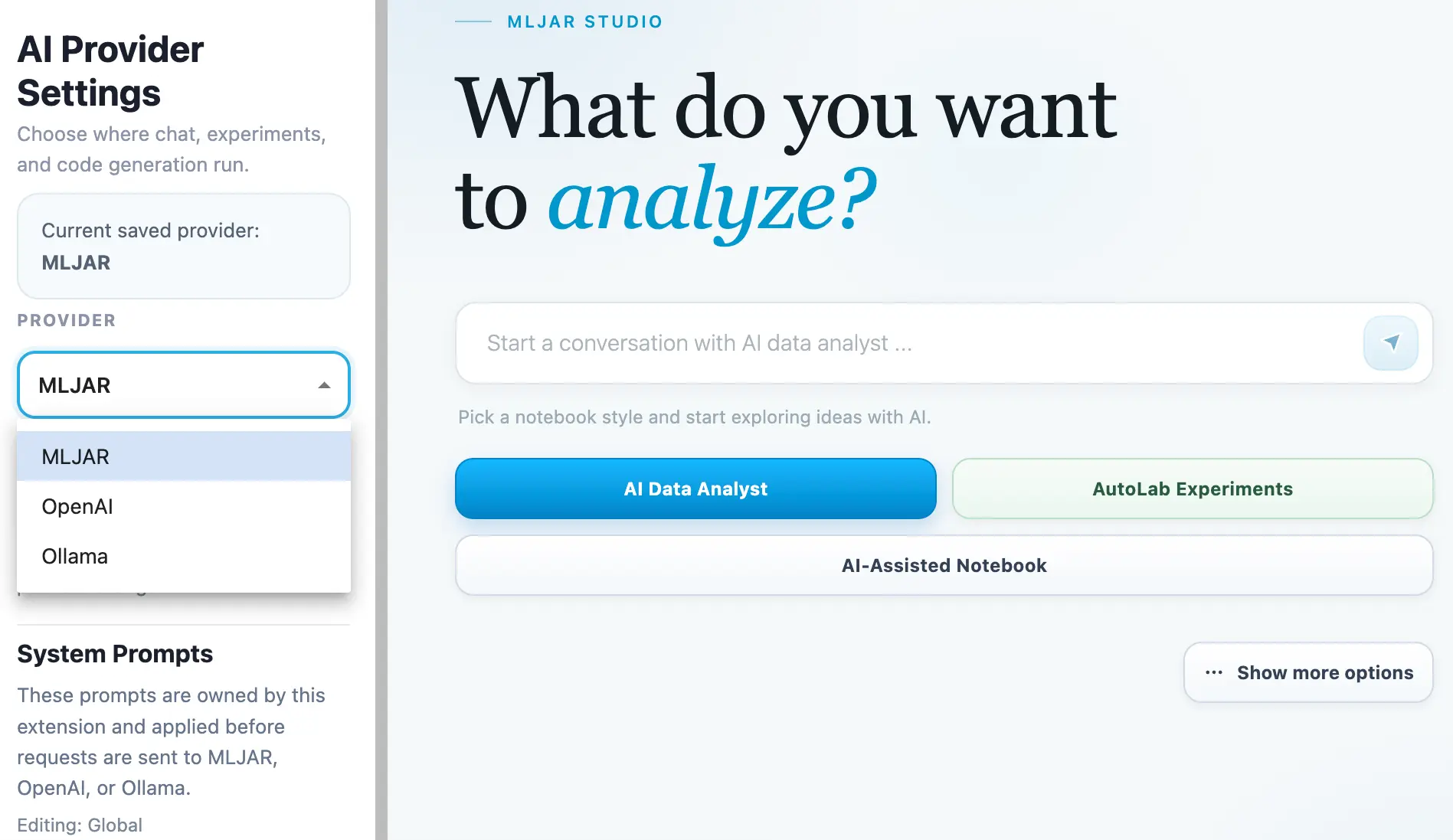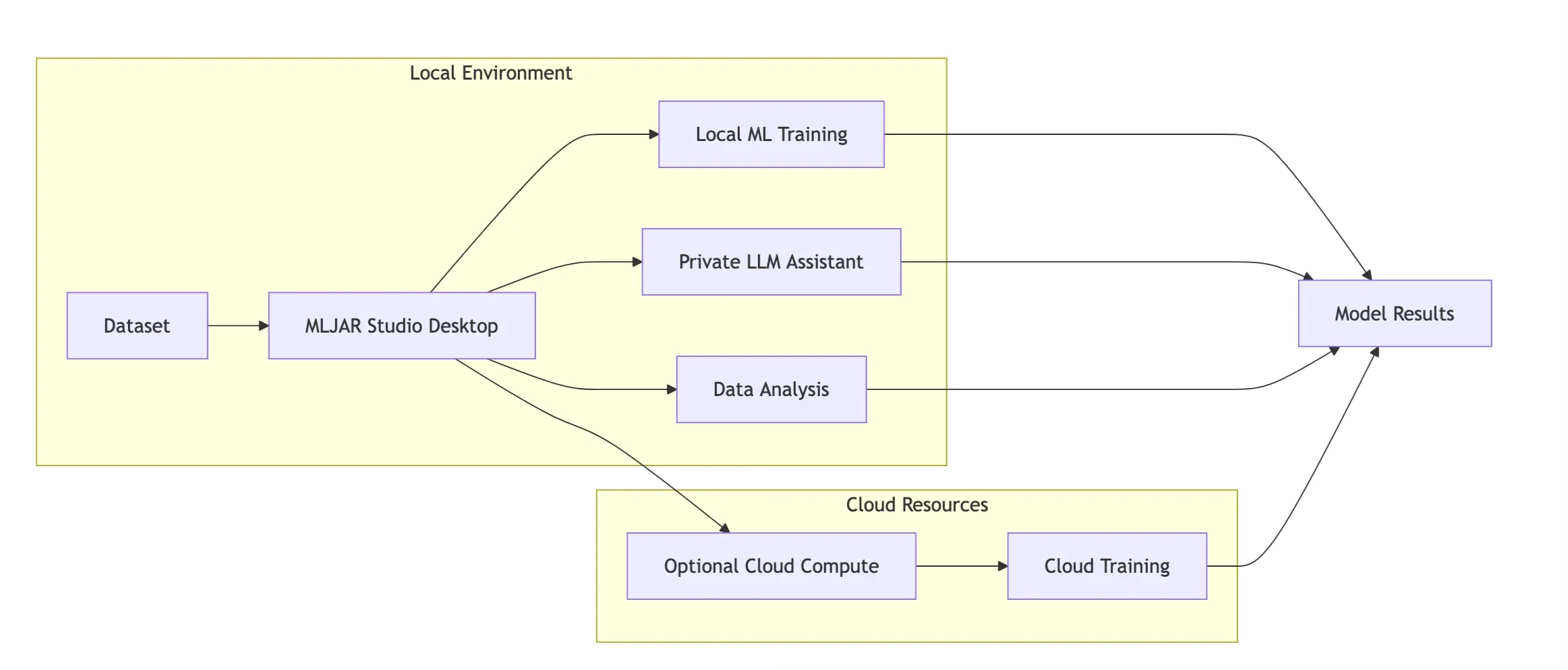 At the same time, MLJAR Studio supports hybrid AI workflows that combine local privacy with optional cloud scalability. In this approach: