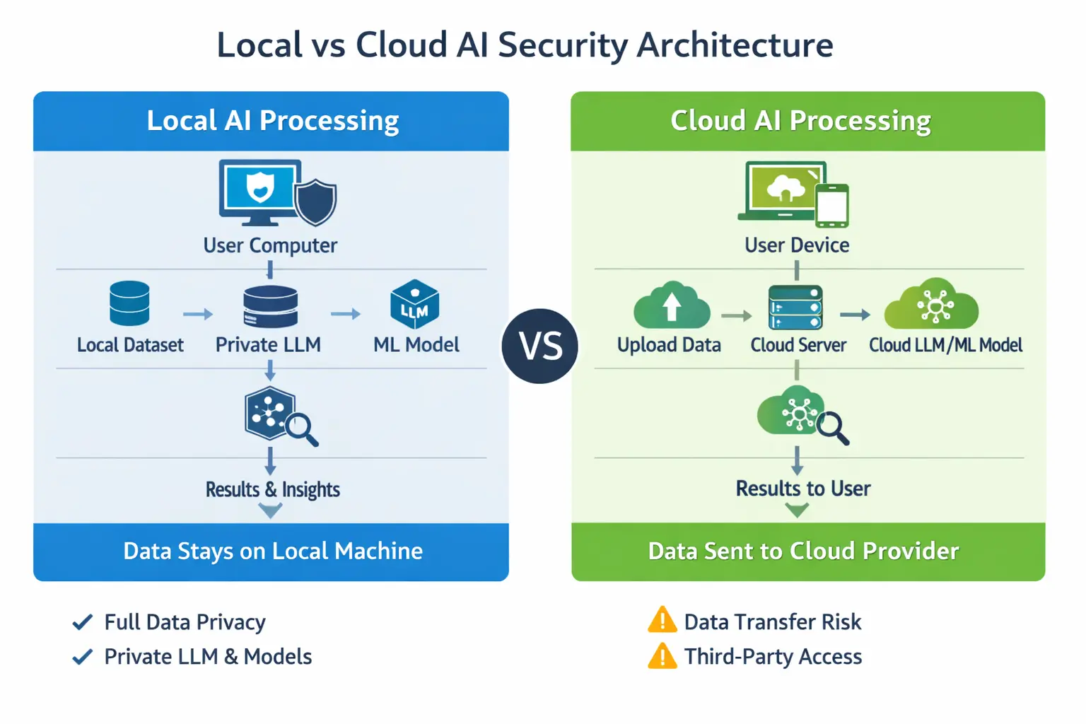 Cloud platforms provide powerful infrastructure, but sending sensitive data to external servers can introduce several risks, like data leaks caused by misconfigured storage, unauthorized access to datasets, regulatory compliance issues, or exposure of proprietary information. In some cases, organizations must comply with strict data protection laws such as GDPR in Europe, HIPAA in healthcare, financial industry regulations. For these environments, local data processing can provide a safer alternative.