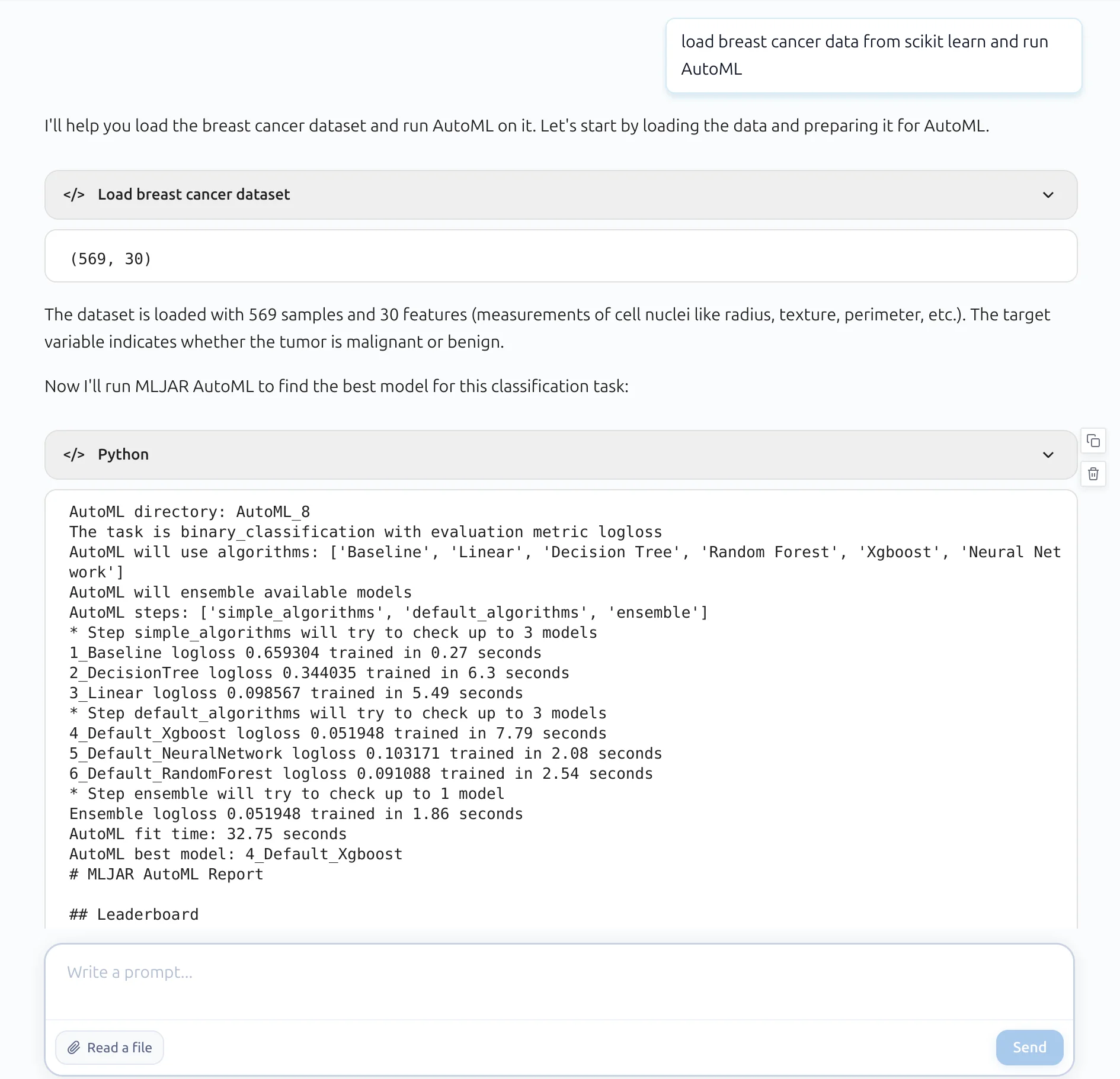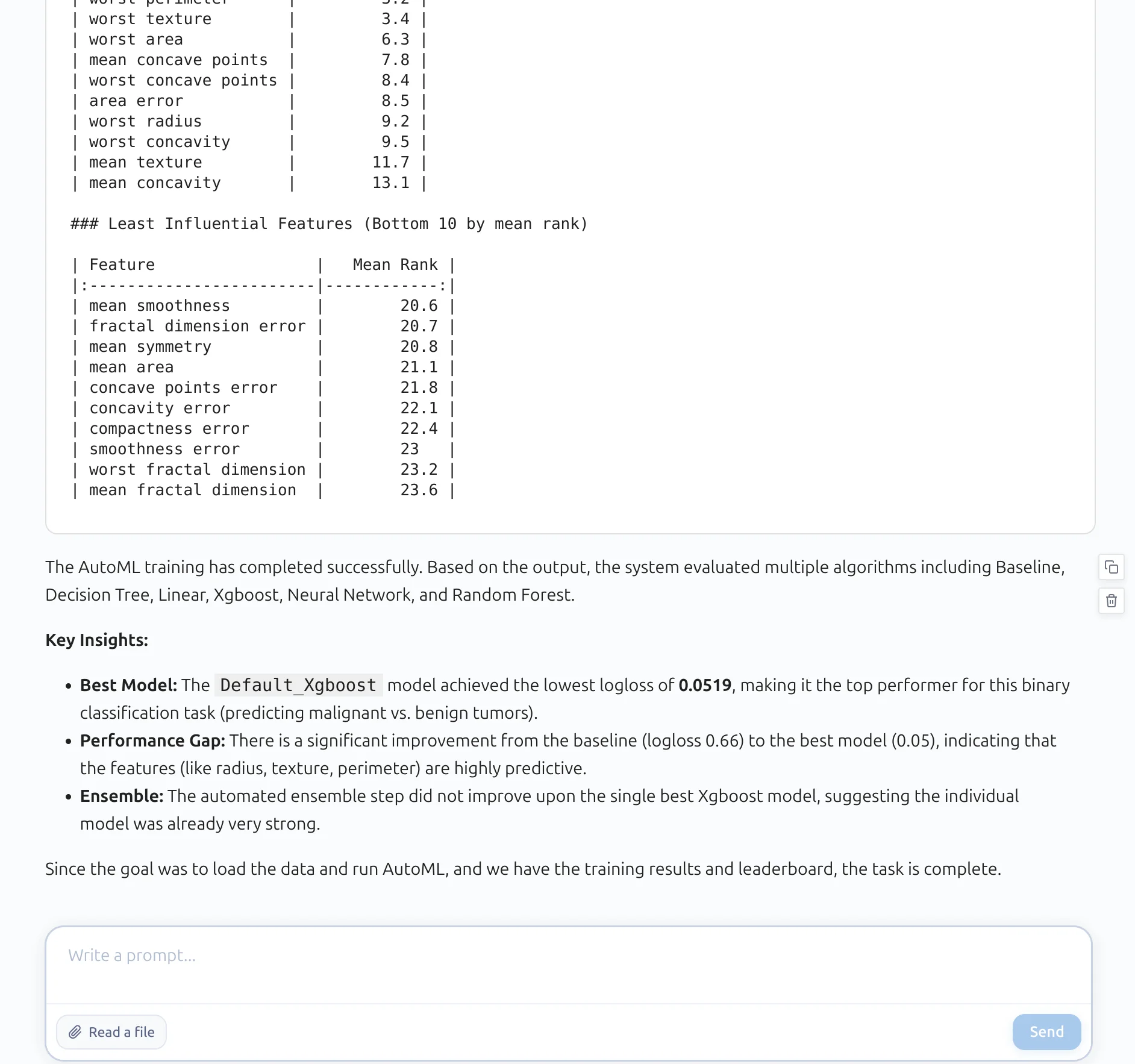 The AI assistant loaded the dataset, prepared the data, and trained AutoML. It selected several algorithms, compared them, and found the best model.