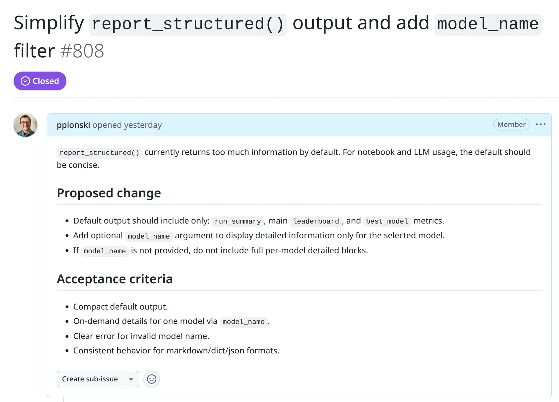 To support these new AI workflows, we introduced a structured AutoML report. It is available from version 1.2.2 in mljar-supervised, it was added in below GitHub issues: