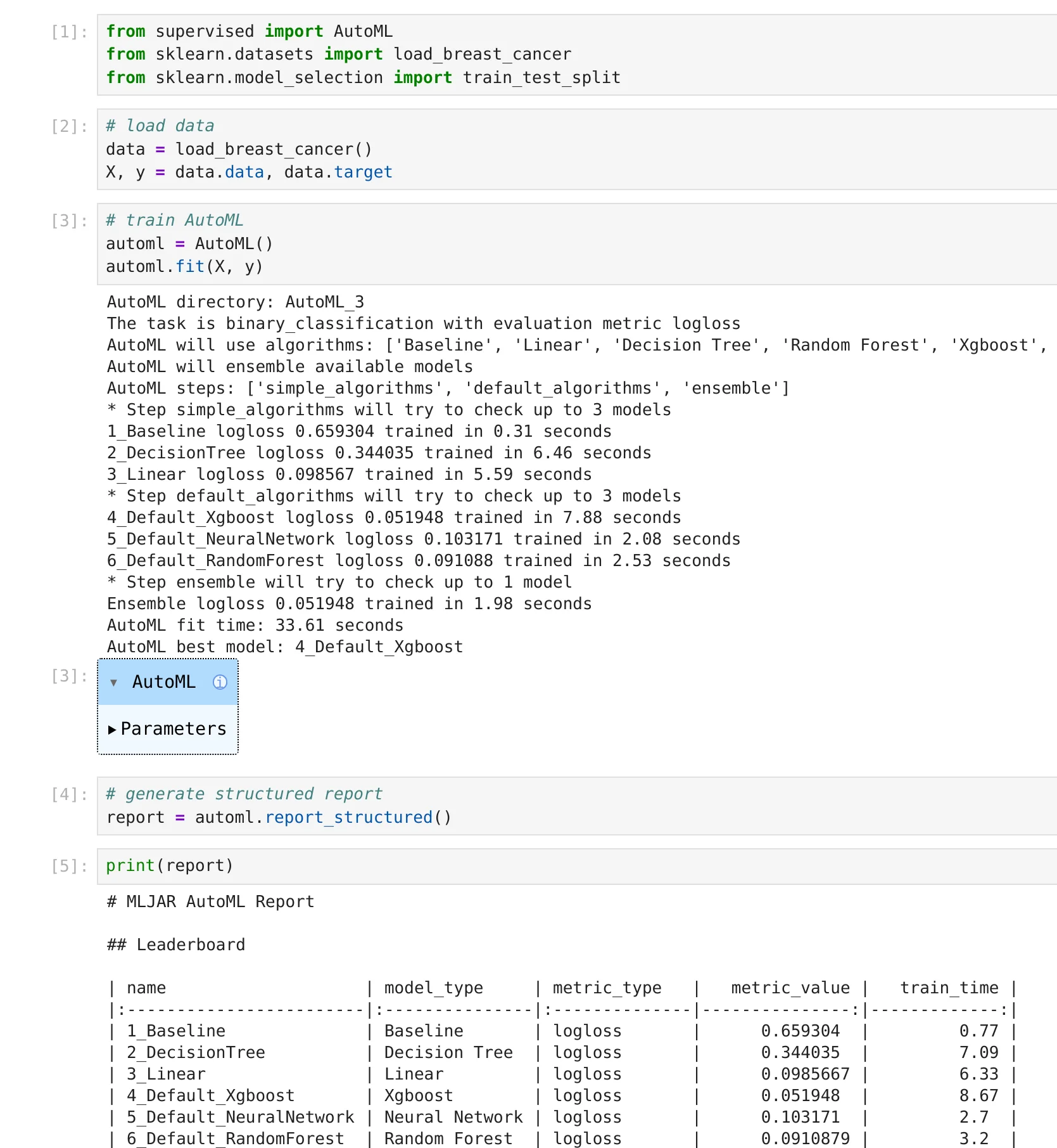 from supervised import AutoML from sklearn.datasets import load_breast_cancer # load data data = load_breast_cancer() X, y = data.data, data.target # train AutoML automl = AutoML() automl.fit(X, y) # generate structured report report = automl.report_structured()